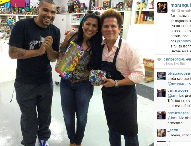 - 13.mai.2014- Naldo e Ellen Cardoso visitam o artista plástico brasileiro Romero Britto em Miami. Moranguinho contou em seu Instagram que ganhou uma Barbie exclusiva e que se emocionou. "Sem palavra para descrever esse ser abençoado, iluminado e talentoso. Parou tudo com o maior carinho para nos mostrar o passo a passo de tudo e todo o seu acervo de enlouquecer... Não consegui controlar a emoção e fui às lágrimas quando recebi de presente uma Barbie exclusiva com sua arte" Reprodução/Instagram Mais