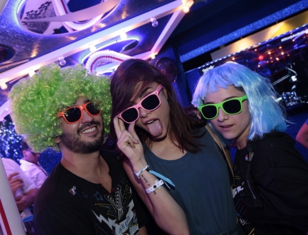 20.set.2015 - Amigos, Maria Casadevall, Lucy Ramos e Gil Coelho se encontram no meio da noite no Rock in Rio. Todos estão no ar em "I Love Paraisópolis" AgNews Mais