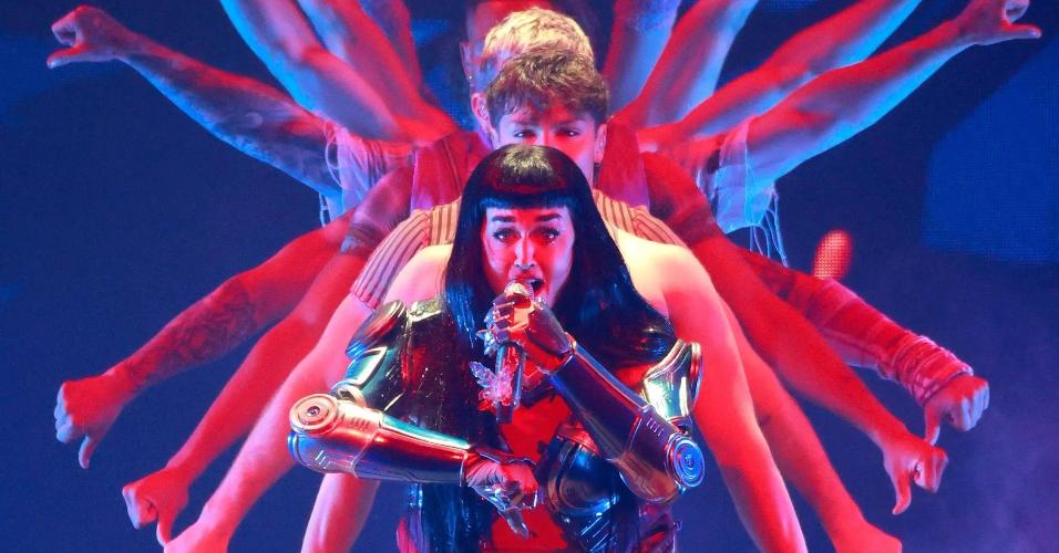 - 26.jan.2014 - Katy Perry apresentou seu single "Dark Horse", durante a cerimônia do Grammy em Los Angeles, neste domingo (26). Reuters Mais